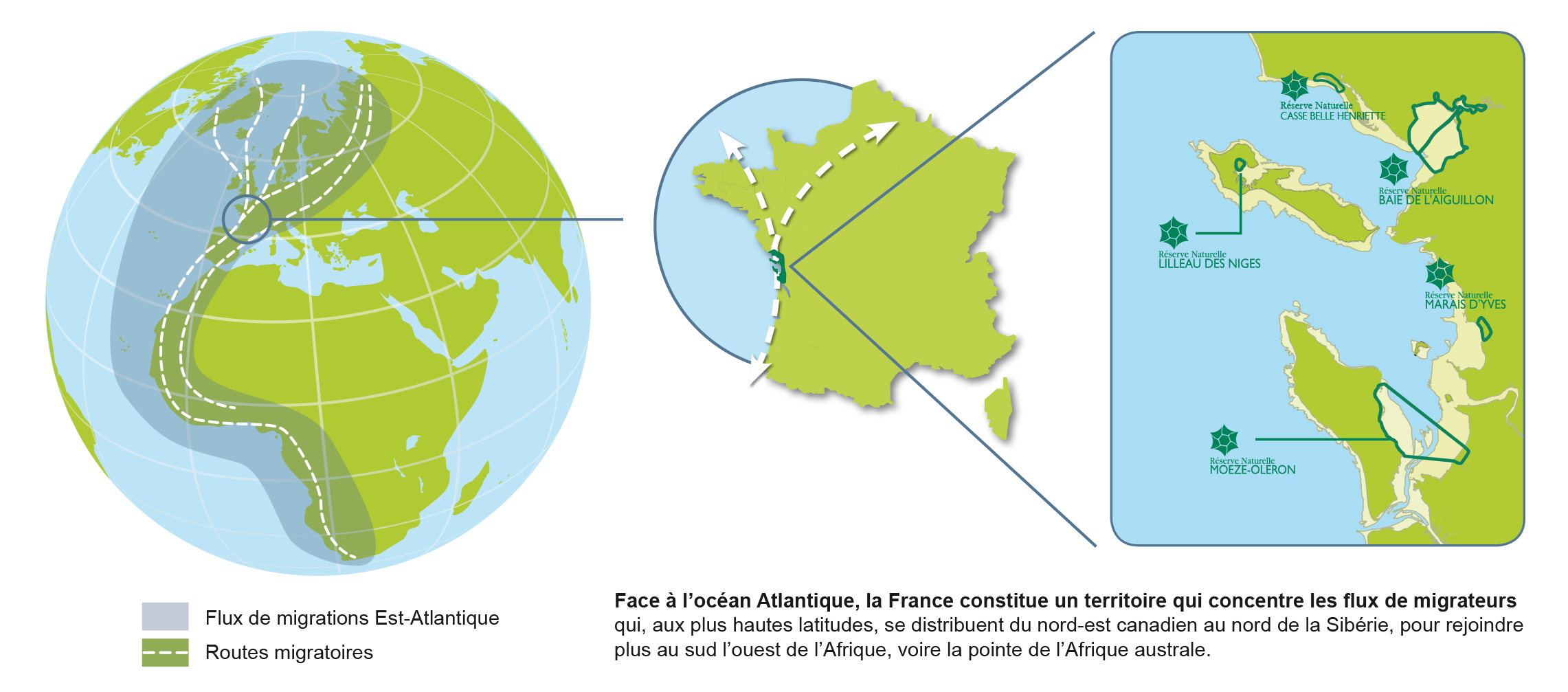 Située au cœur du bassin fonctionnel des Pertuis charentais, la réserve relie estrans, marais et zones conchylicoles, formant un maillon essentiel des grands couloirs migratoires atlantiques et contribuant à la conservation de nombreuses espèces d’oiseaux d’eau à l’échelle internationale (Figure 2).