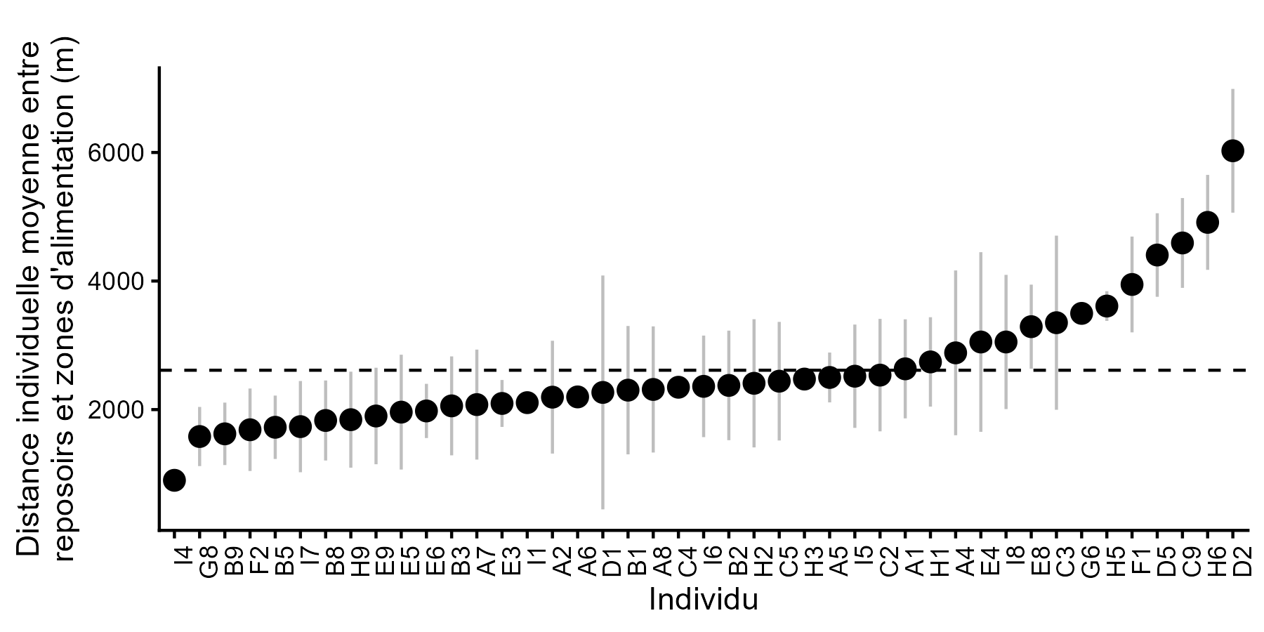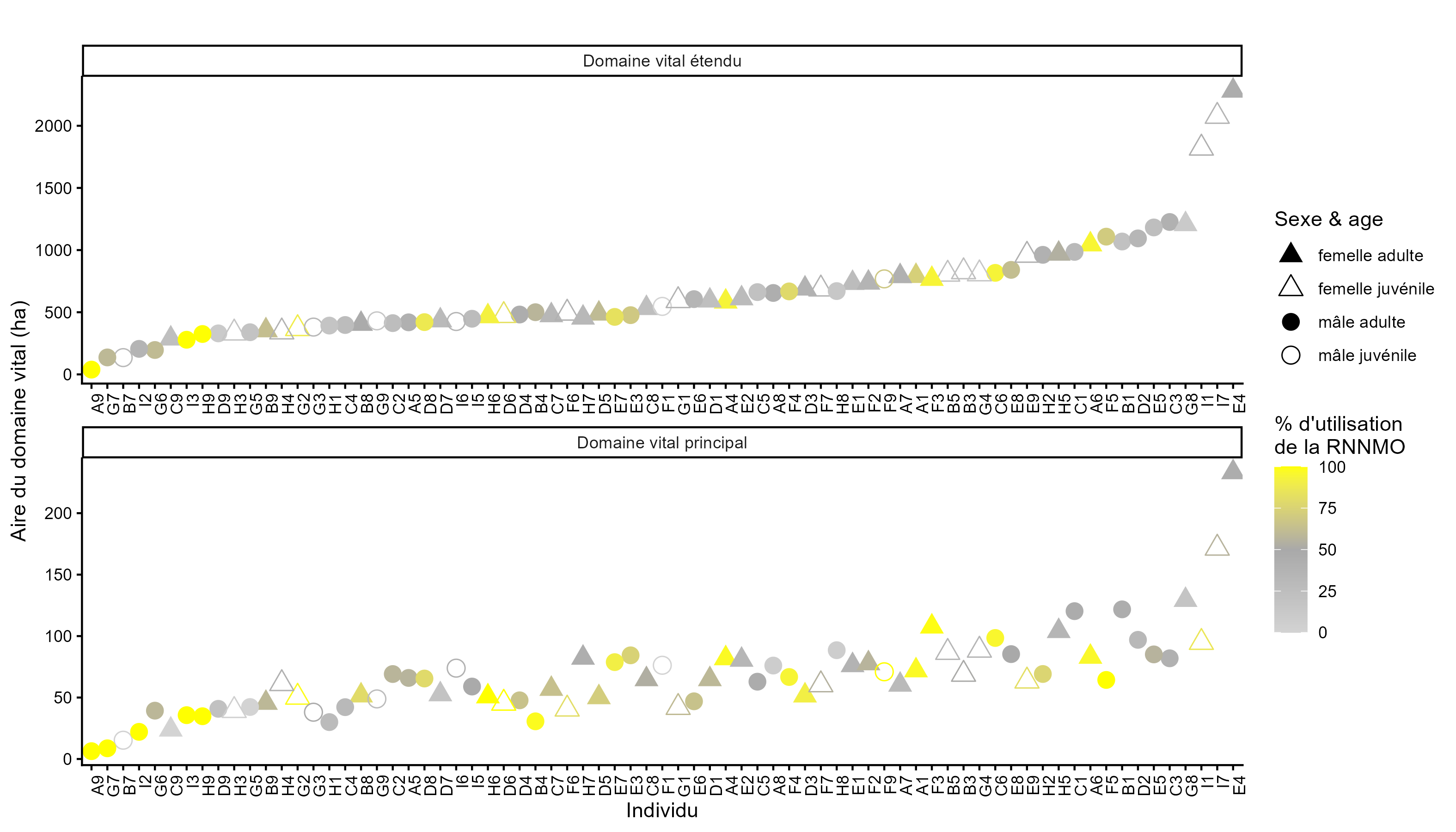 Les individus ont des domaines vitaux principaux d’une surface moyenne 67 (± 33) ha et des domaines vitaux étendus d’une surface moyenne de 644 (± 389) ha (Figure 11).