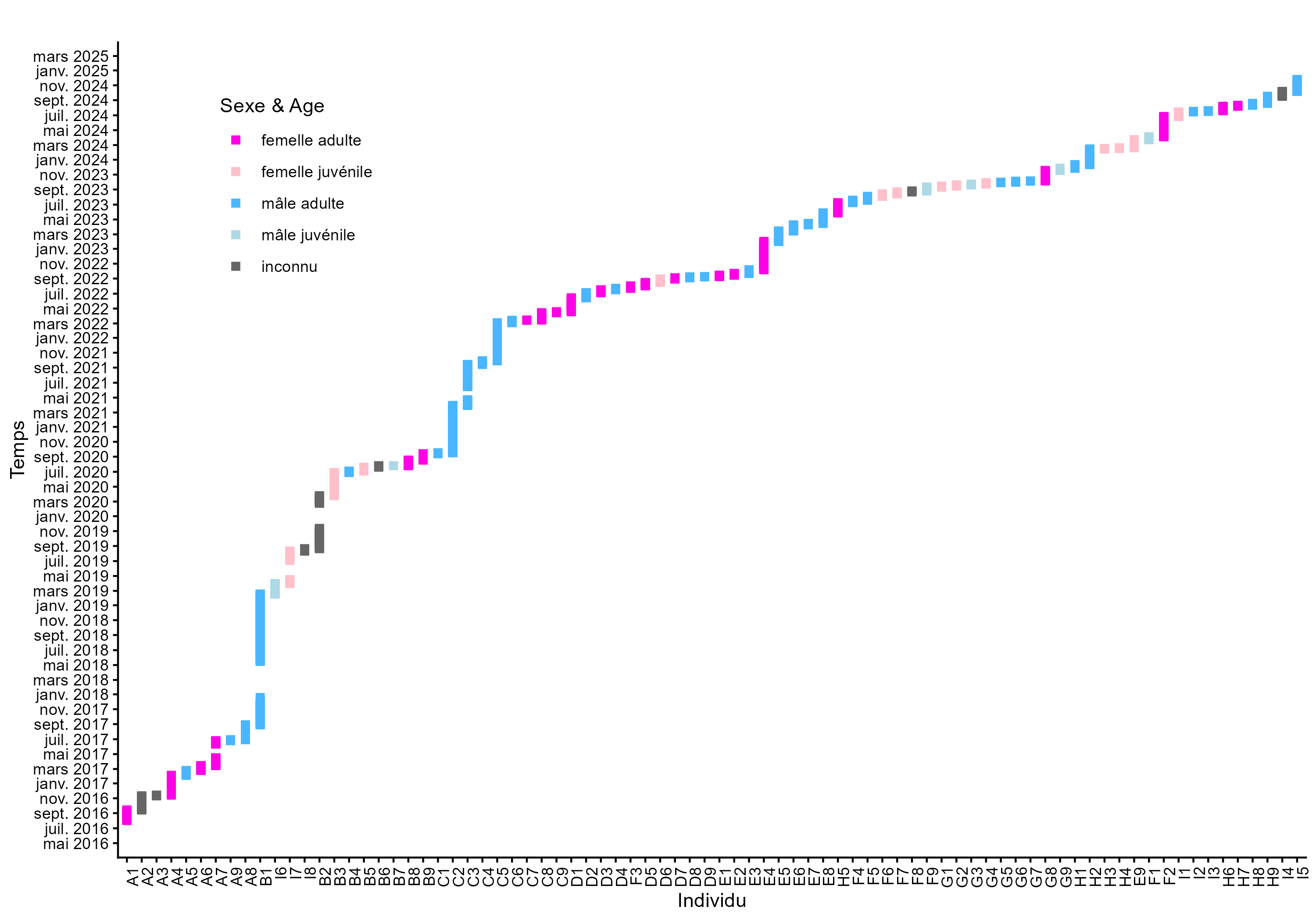 Le jeu de données analysé est constitué de 2 226 196 points GPS enregistrés entre 2016 et 2024 pour 80 individus. Le nombre de points GPS analysés par individu est d’un minimum de 365 et maximum de 118 314, pour une moyenne de 26 960 (Annexe 3). Les données comportent 35 femelles, 38 mâles, 60 adultes et 20 juvéniles. Le sexe n’a pas été identifié pour 7 individus (Figure 6).