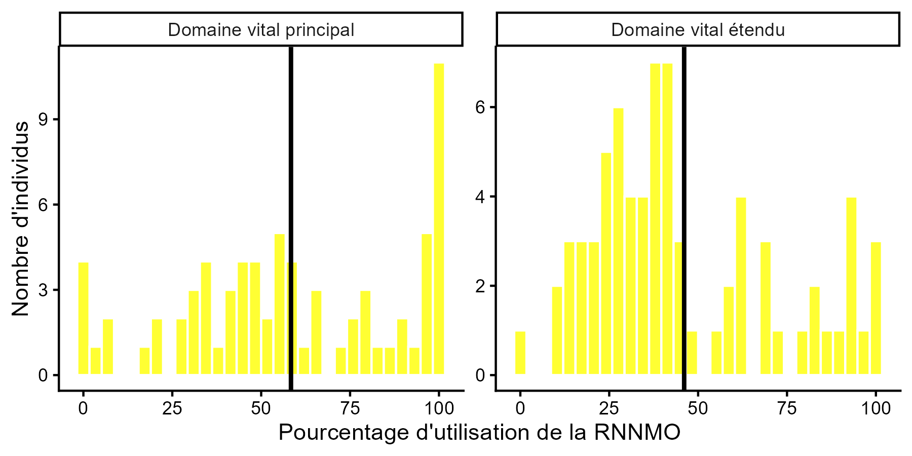 En moyenne, les Courlis cendrés utilisent la RNNMO 52% de leur temps. Leurs déplacements au sein de leur domaine vital principal sont à 58% dans la RNNMO, et 46% de leurs déplacements au sein de leur domaine vital étendu sont dans la RNNMO (Figure 12).