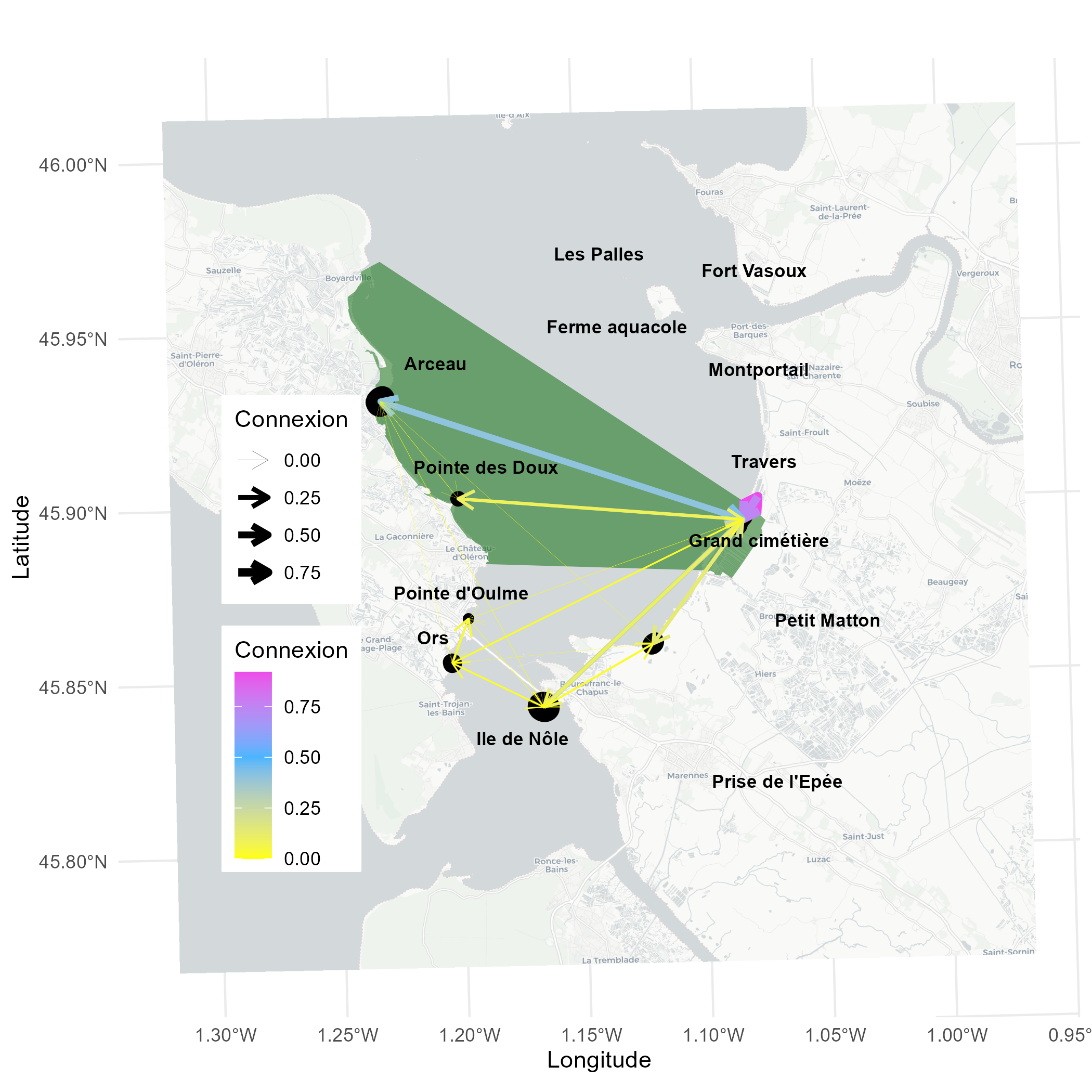 Reposoirs et zones d’alimentation : Les courlis alternent entre reposoirs à marées hautes et zones d’alimentation à marées basses, situés dans et hors réserve naturelle, surtout dans le bassin de Marennes et le marais de Brouage. Les zones d’alimentation se concentrent sur les vasières côtières et les prés salés, tandis que les reposoirs se situent en zones plus sécurisées du vent. Les jeunes individus parcourent de plus grandes distances entre repos et alimentation, signe d’un comportement plus exploratoire et/ou d’une moindre efficacité dans la recherche alimentaire en temps normal. La fidélité spatiale est marquée : les courlis reviennent régulièrement sur les mêmes reposoirs, notamment à Travers, au Grand Cimetière et à Arceau.