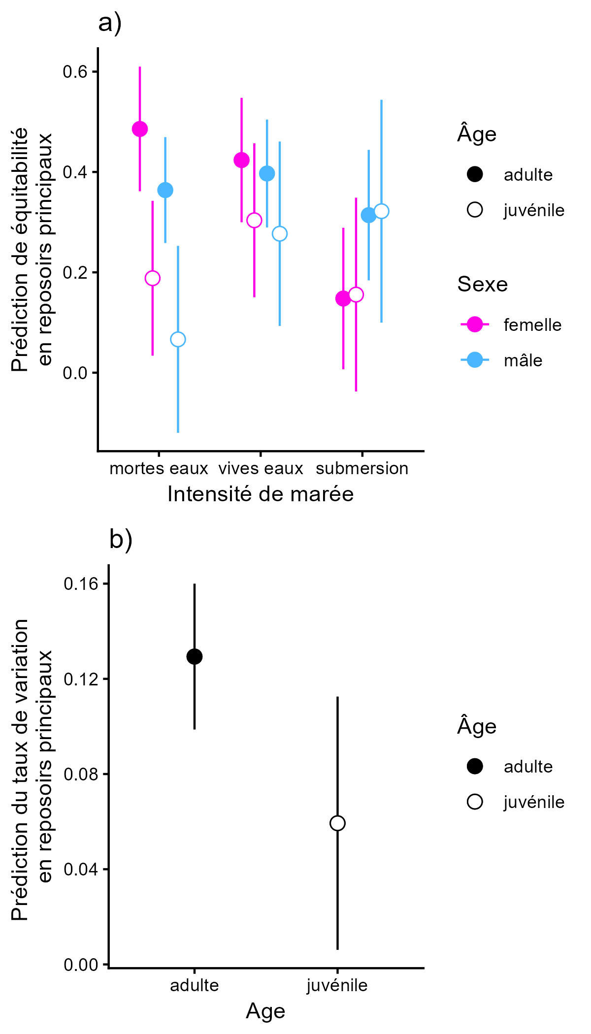 Les Courlis cendrés juvéniles étant moins expérimentés que les adultes, il est attendu qu’ils utilisent des reposoirs différents et moins favorables que ceux utilisés par les adultes.