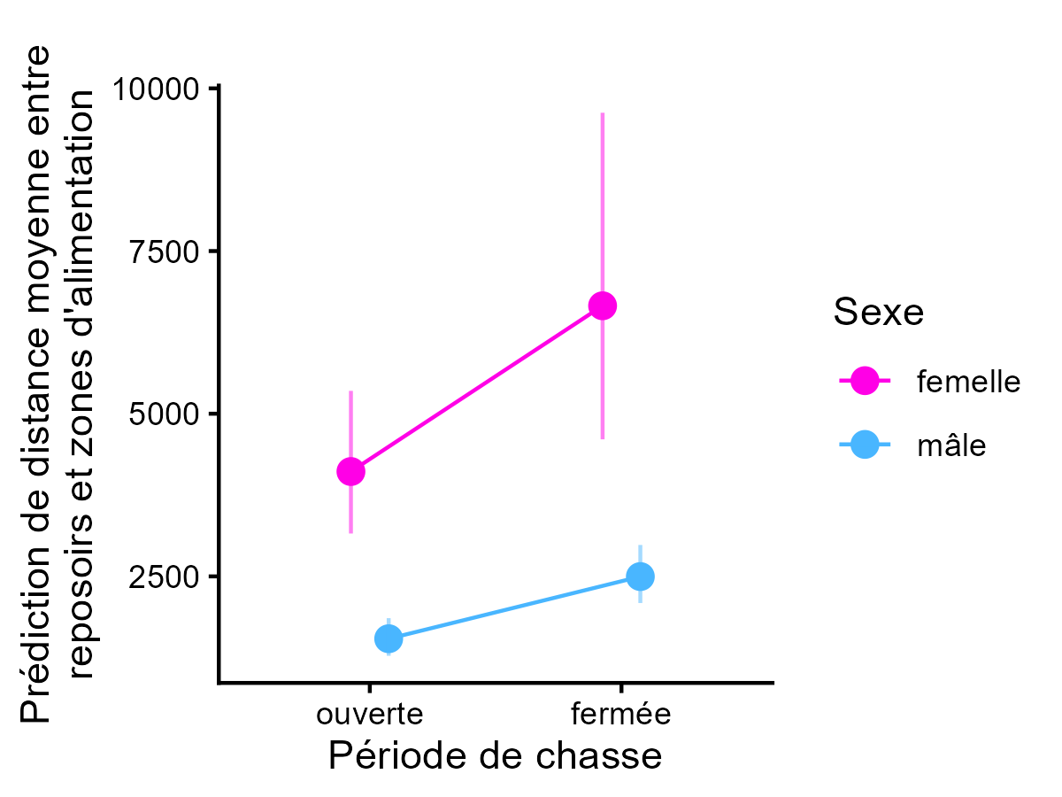Modèle : distance moyenne “zone d’alimentation” vs “reposoirs” ~ sexe + période de chasse