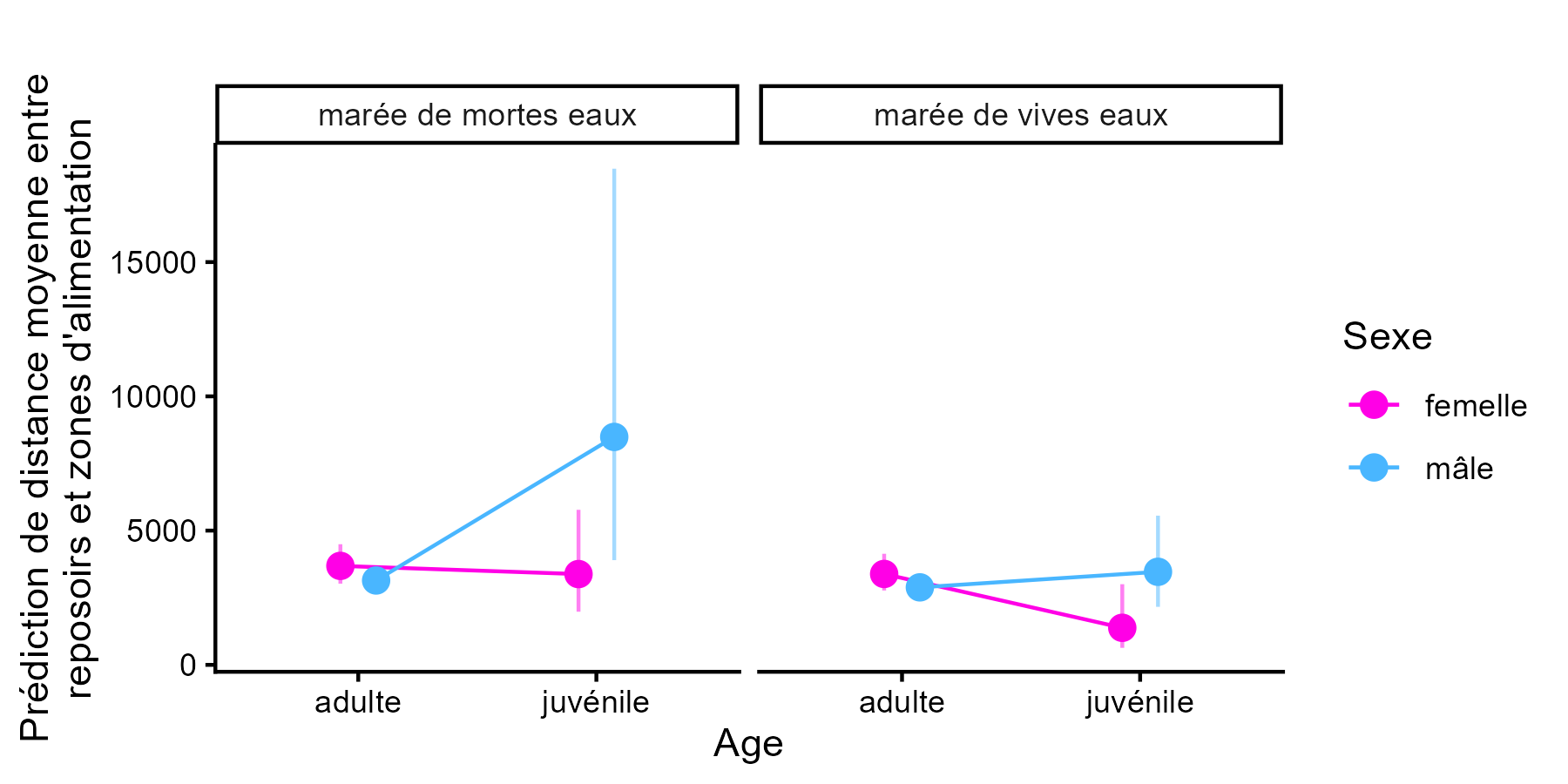 Modèle : distance moyenne “zone d’alimentation” vs “reposoirs” ~ sexe * âge + hauteur d’eau * âge